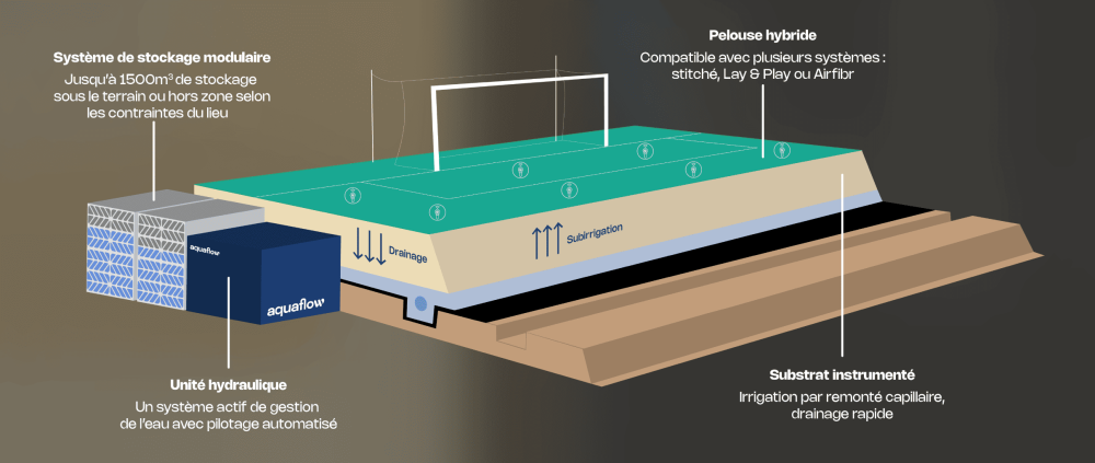 Pour accompagner les clubs et collectivités face à ces défis, Natural Grass a développé une solution qui bouleverse les systèmes traditionnels d'arrosage dans le sport : aquaflow, un système d'irrigation en circuit fermé 0 gaspillage.